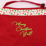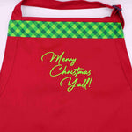 Get festive in the kitchen with this red apron featuring the cheerful phrase "Merry Christmas Y'all!" Designed for durability and comfort, it's the perfect choice for all your holiday cooking and baking!